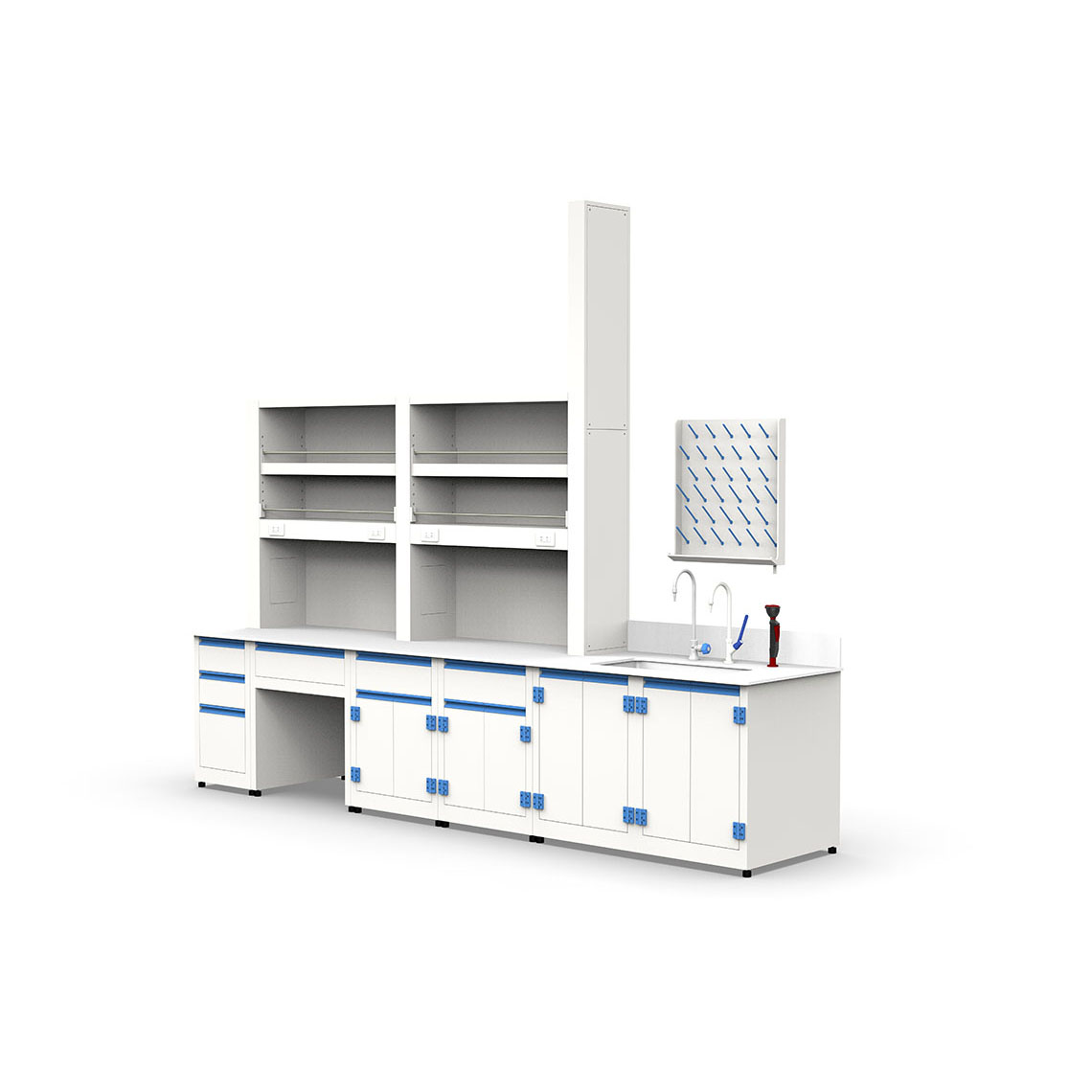 下方櫃體提供多形式儲物空間,包括抽屜櫃、抽屜雙門櫃,部分區域預留腿部空間,支援坐姿操作。 - 桌面可選用可耐王水等級化學專用板材