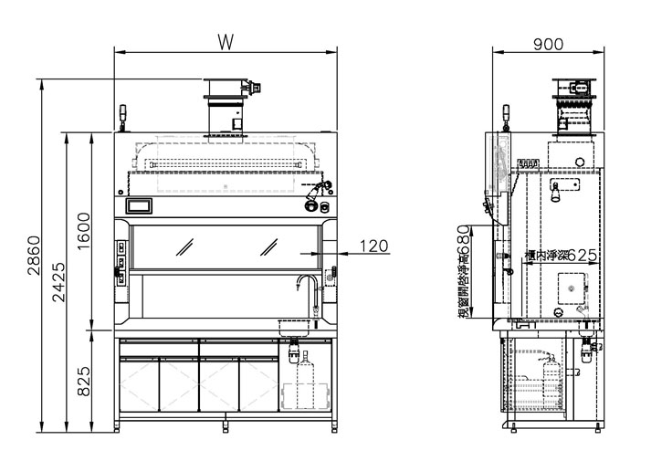 下方鋼製櫃體提供多門收納空間,可存放化學藥品與儀器設備,亦可依需求加裝排氣功能、廢液桶空間或給排水配件,提升整體應用效率。