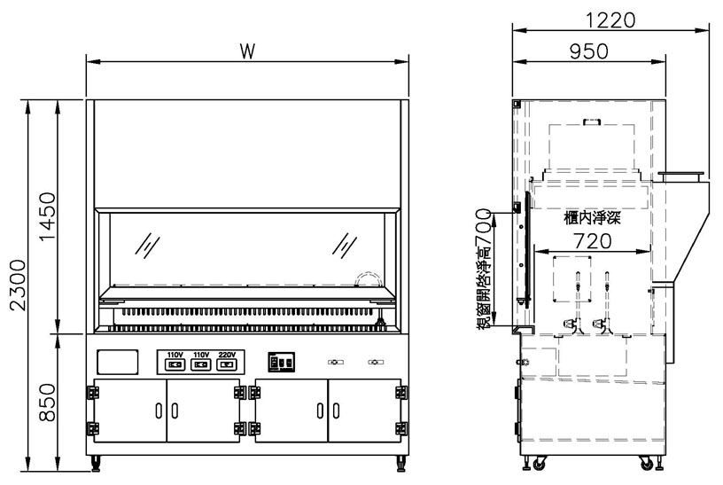 下方櫃體整合儲藏空間與抽氣導管系統,並配置檢修口與管道檢視窗,方便維護管理。 - 底部活動輪設計(可選)
