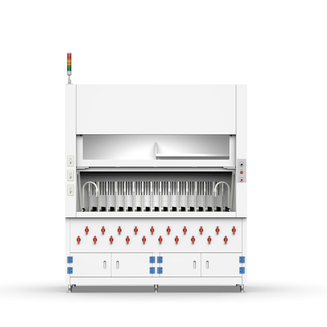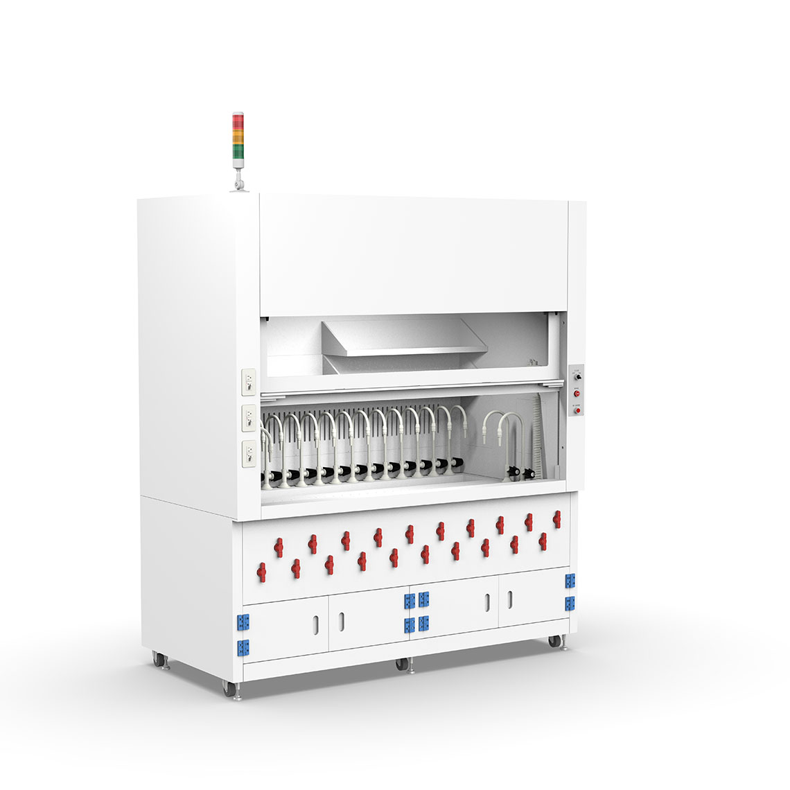櫃體上方設置三色燈,可即時顯示設備運轉、待機或異常狀態,使人員於遠距即可快速判斷設備狀況,提升實驗室安全管理與作業效率。 - 下方 PP 收納櫃體