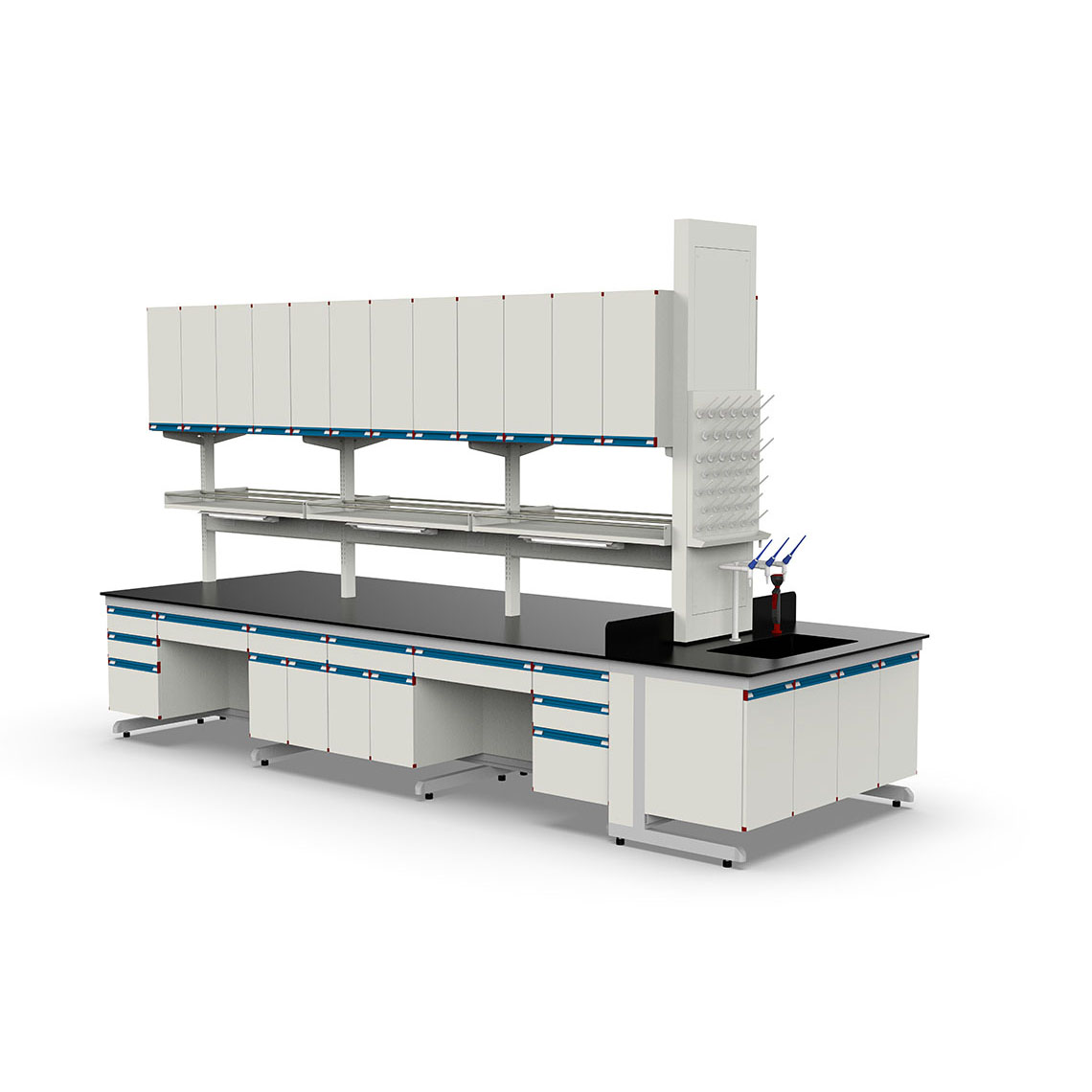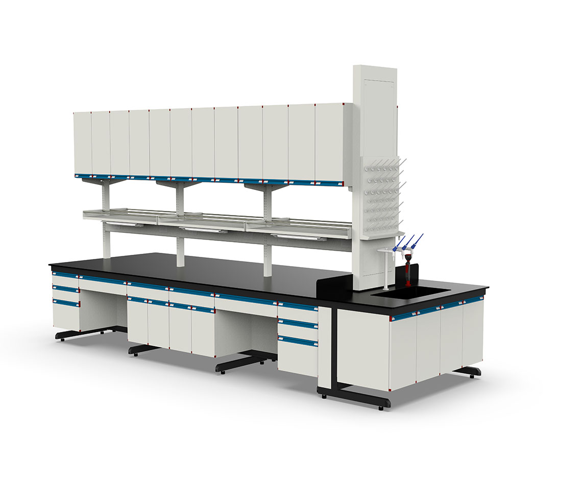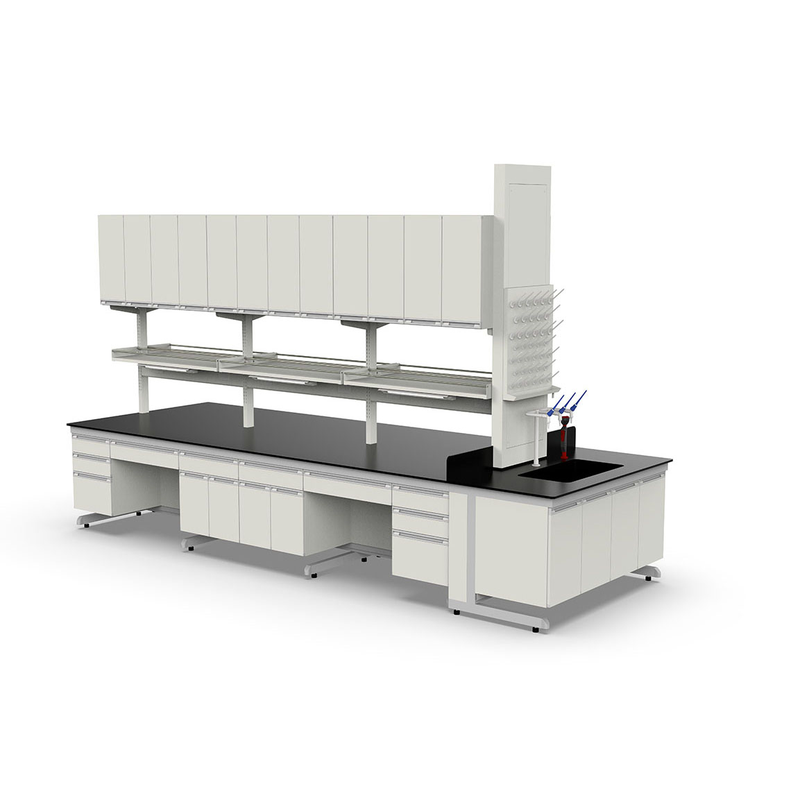 - 高掛式壁櫃儲物系統:實驗桌上方設有吊掛式壁櫃,提供封閉式儲物空間,有效隔絕實驗室灰塵與污染,適合存放常用但須潔淨保存之器材或文件。
