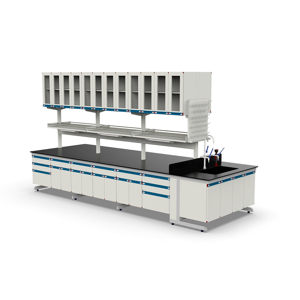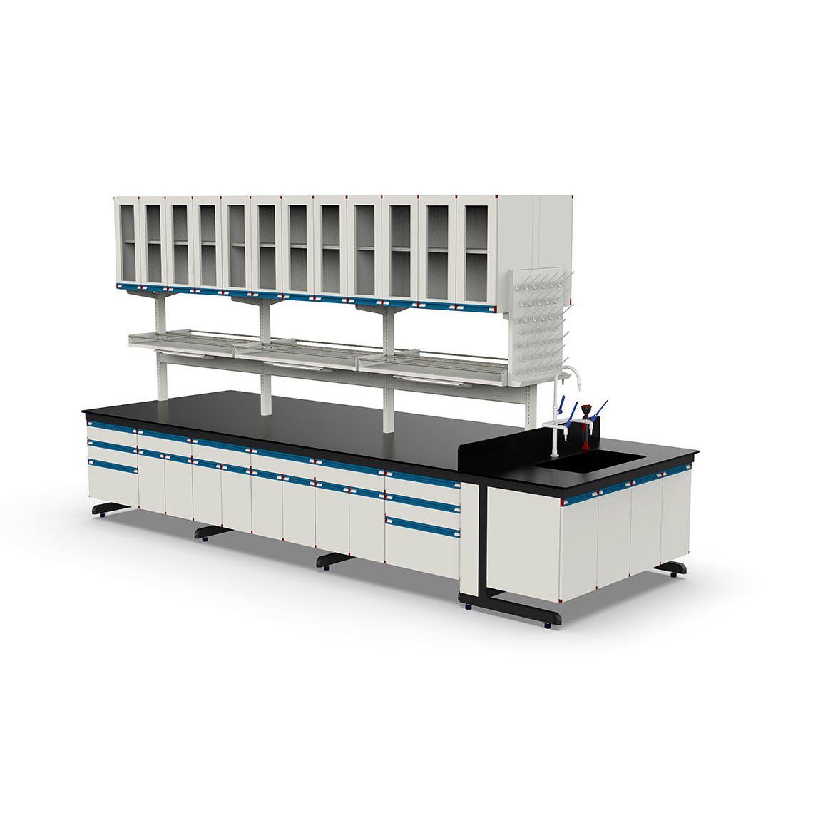 此款中央型實驗桌採用高耐蝕等級之實心抗蝕化學板為檯面材質,具備優異的抗化學腐蝕能力,適用於各類高腐蝕性實驗,包含可耐王水等級的操作。整體結構以鋼構與鋼製下櫃為主體,穩固耐用,搭配模組化收納設計,提升實驗室空間的整合效率。