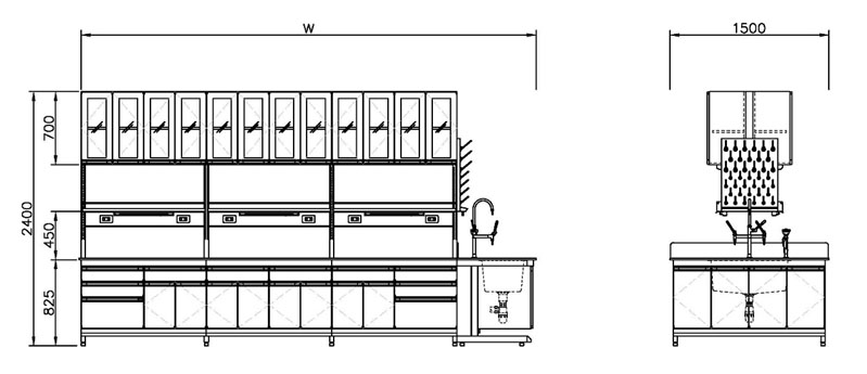 中央實驗水槽桌/門型玻璃壁櫃/鋼製藥架-鋼吊鋼-4380x1520x825/2400 mm