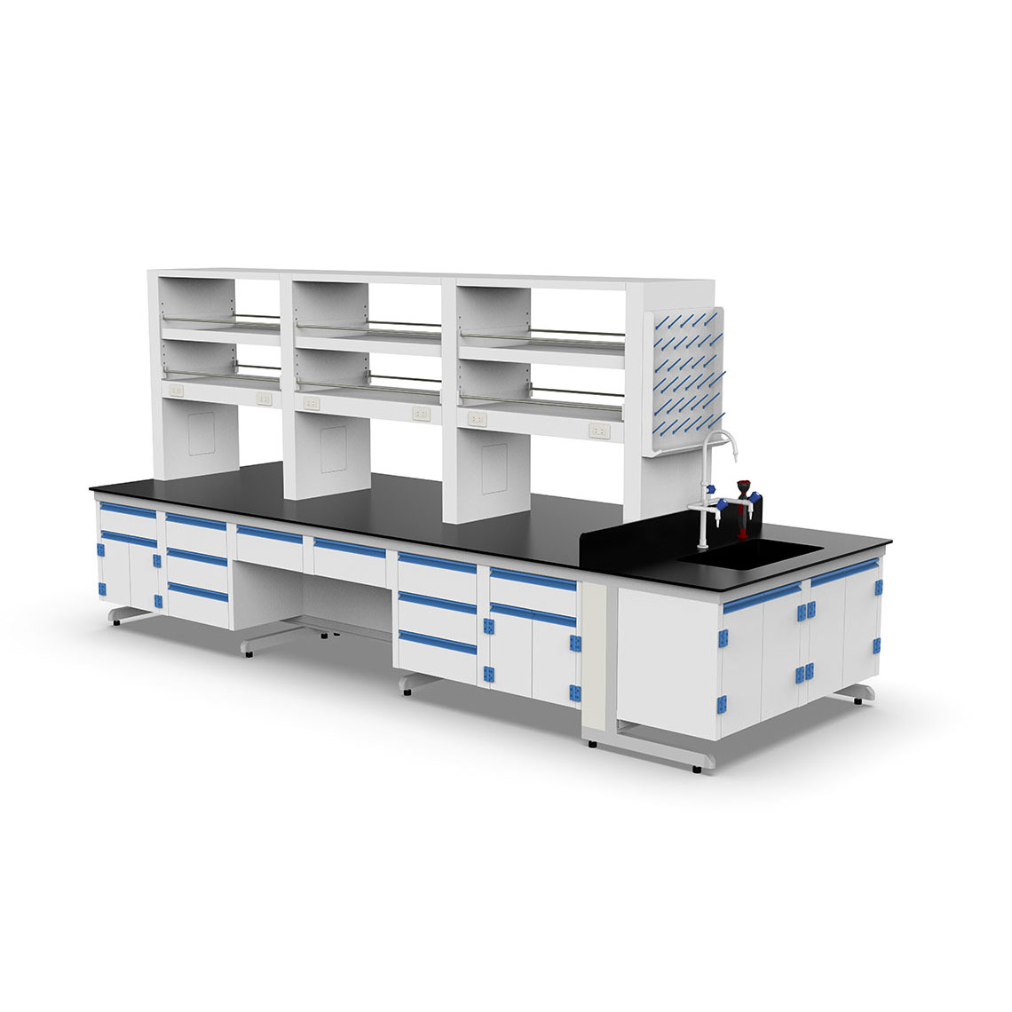 - 懸吊式櫃體採用PP材質:下方櫃體使用高耐腐蝕性聚丙烯(PP)材料,具備抗酸鹼、抗腐蝕特性,適合長期儲存實驗耗材與化學試劑。