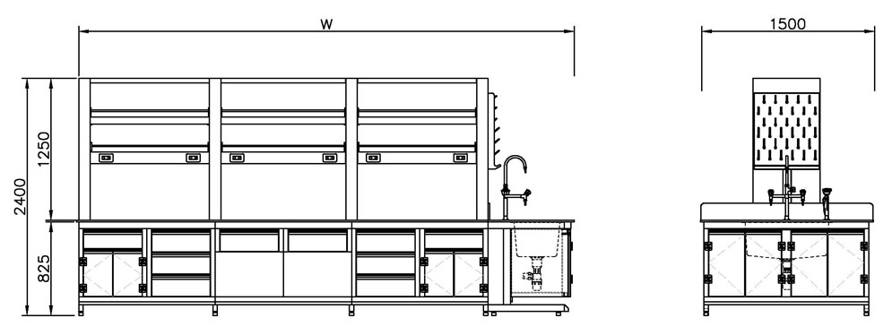 - 模組化設計:實驗桌下方櫃體可依實驗需求調整為抽屜式、開放式、門櫃或預留座位空間,提升工作動線彈性。