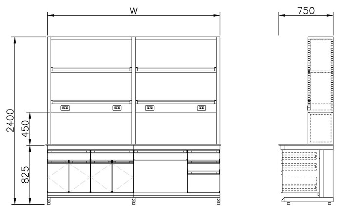 靠邊實驗桌/桌上型鋼製藥架-鋼吊鋼-2400x750x825/2350 mm