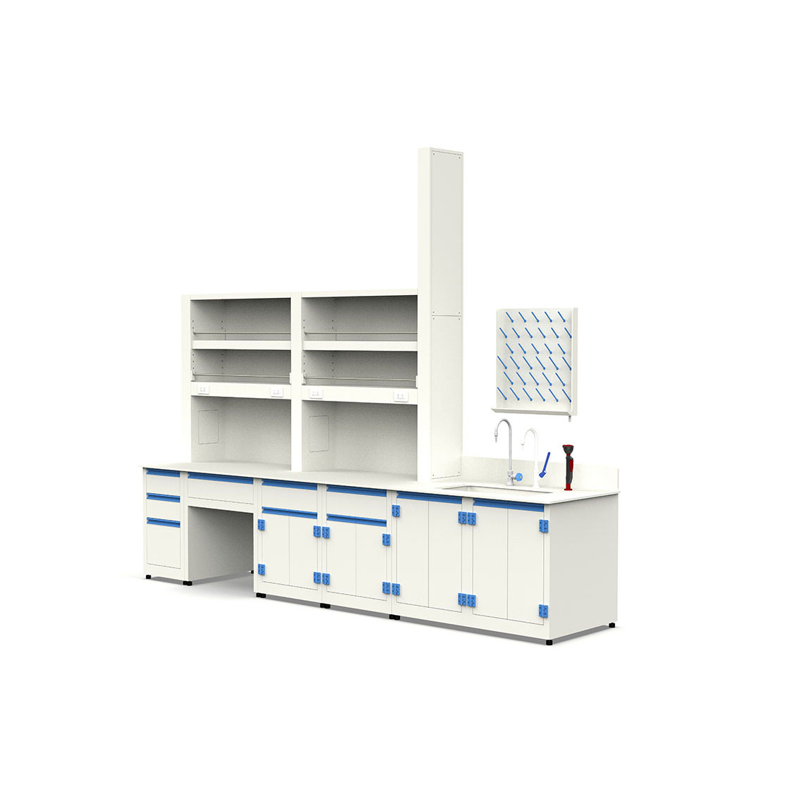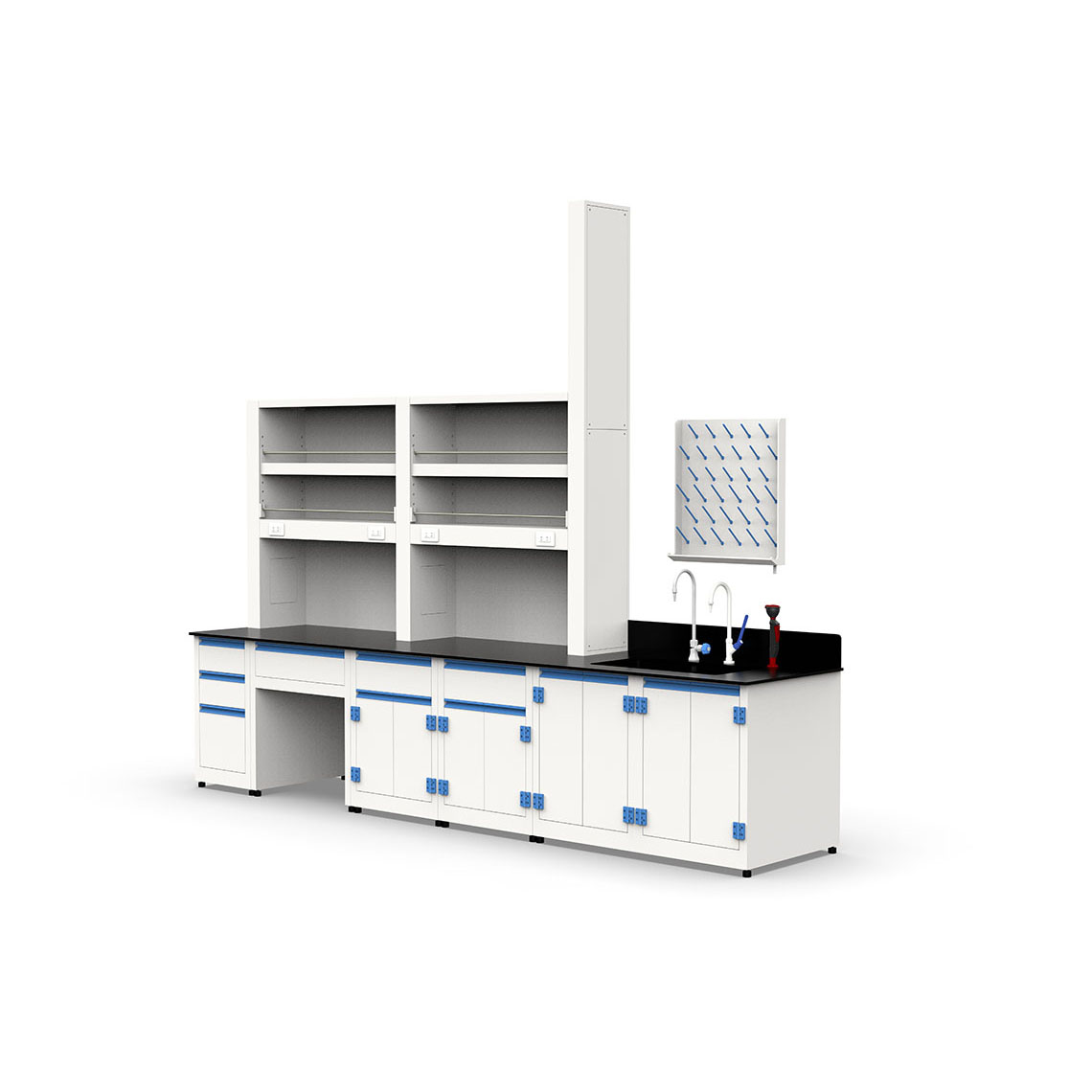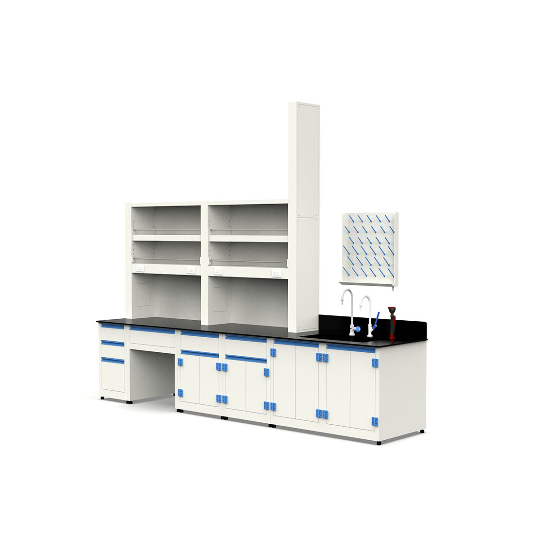 下方櫃體提供多形式儲物空間,包括抽屜櫃、抽屜雙門櫃,部分區域預留腿部空間,支援坐姿操作。 - 桌面可選用可耐王水等級化學專用板材