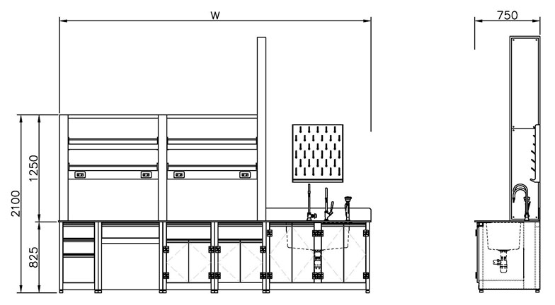 桌面中段配置垂直管槽塔,可用於電力、給排水、氣體或通訊線路垂直導管,便於實驗室整體管線整合與後續維護。 - 下櫃多樣化儲物與座位空間