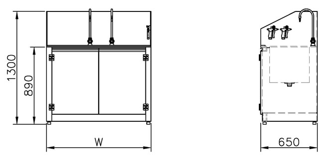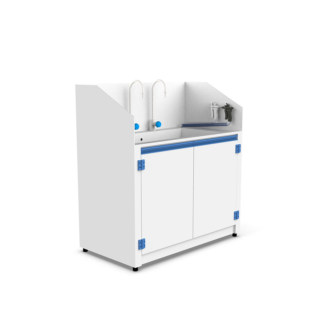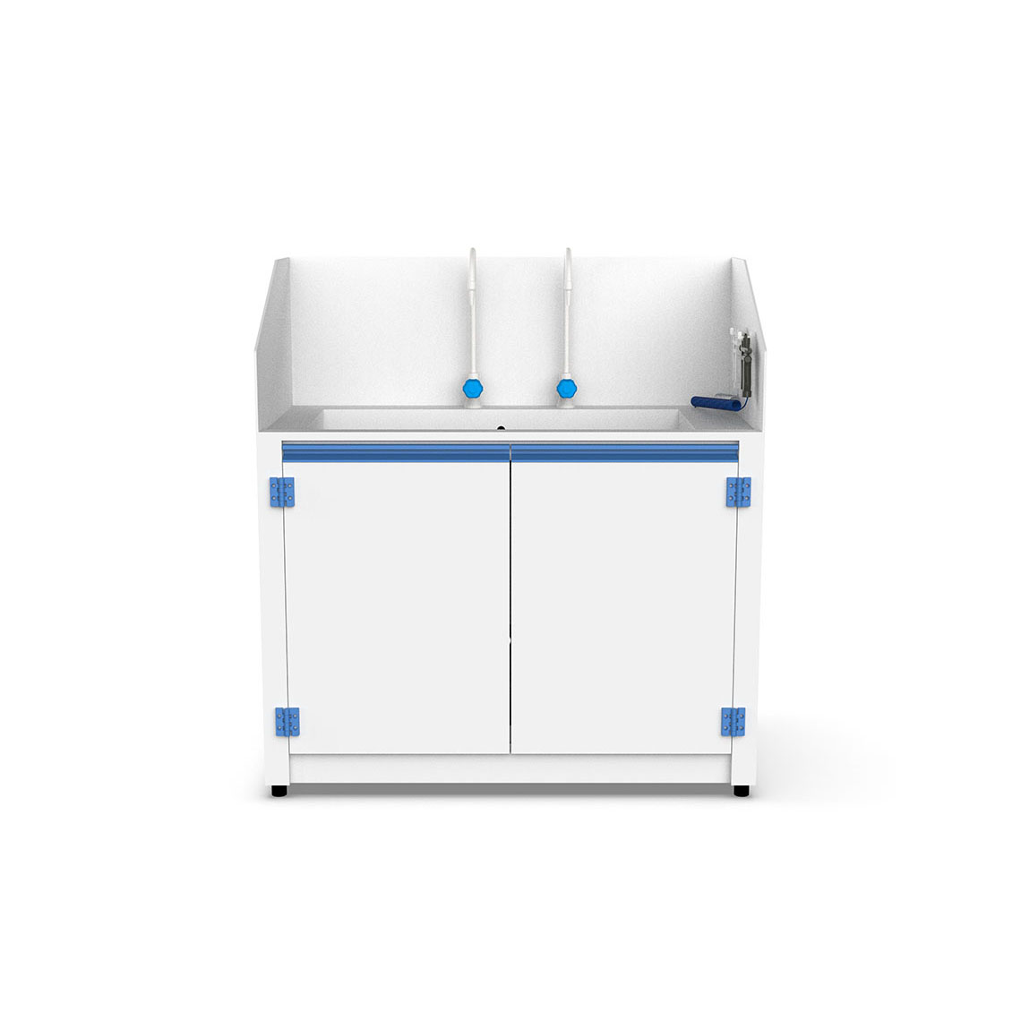 背牆與左右兩側加高設計,有效防止水花與化學液體飛濺至周圍工作區域,提升安全與整潔度。 - 雙開門儲藏空間